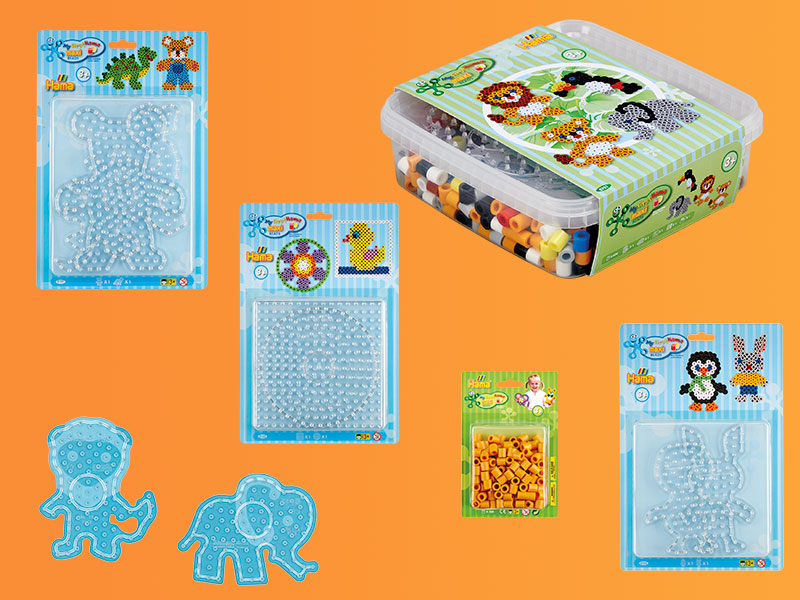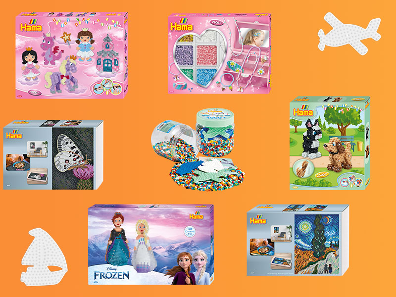 We have made boxes with dogs and cats in two variants – one in 3D, which is assembled with the Hama connector, and one with regular ironable motifs. An activity box with beautiful jewellery for younger children in gorgeous pastel colours. The new pegboards are a plane and a sailing ship. The pegboards are available loose and in various packs, including tub #2053 with a wonderful mix.