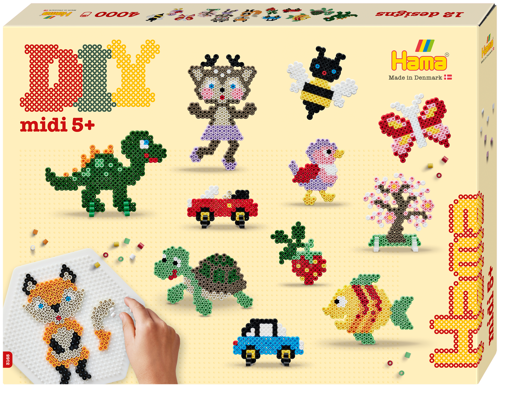 Approx. 4.000 beads, 2 large pegboards: Square No. 234 and hexagonal No. 276. 8 bead supports, colour printed design sheet, instructions and ironing paper.