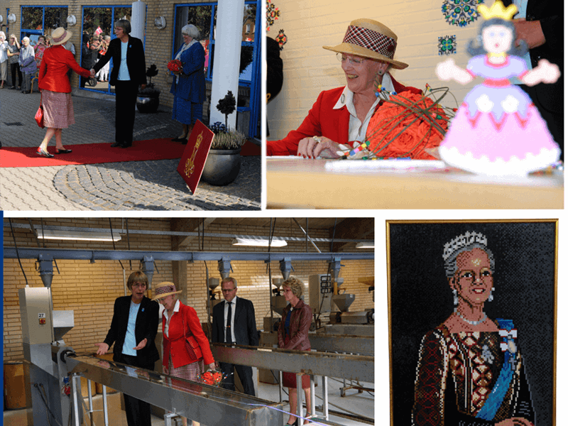 La reina visitó una gran parte de la empresa y también pasó por la zona de diseño donde completó un diseño con cuentas. La visita finalizó con la entrega de un regalo por parte de la empresa: un retrato de la reina Margarita hecho con cuentas Hama y una caja con cuentas Hama para cada uno de sus nietos.